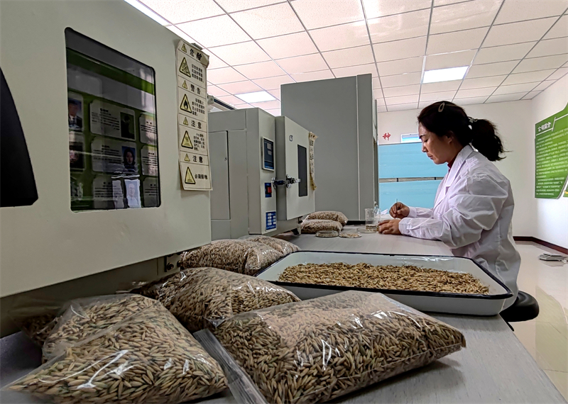通過“柔性引才”模式,普瑞拓公司匯聚了12名高層次人才,先后引進選育“青海444”“青引1號”等10個優良品種,其中“丹牧1號”等8個燕麥品種通過國家或省級審定。在普瑞拓公司實驗室,工作人員精準測定種子發芽率、凈度與純度,目前儲備的3000多噸牧草種子,不僅能滿足全縣15萬畝牧草需求,還遠銷新疆、西藏、內蒙古等多地。